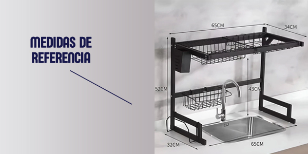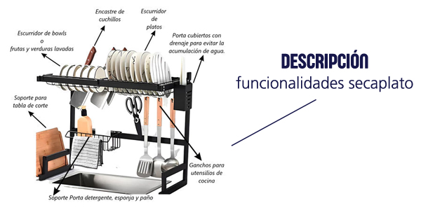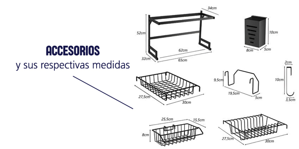 Viene con porta cubiertos con drenaje. Ganchos para utensilios de cocina. Soporte para tabla de madera de corte. Y soporte para detergente y esponja.