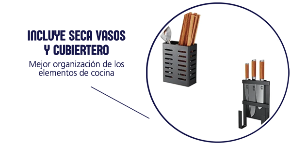 Con unas dimensiones de 57 cm. de altura, 29 cm. profundidad y 40.5 cm. de ancho, este secaplatos se integra sin esfuerzo en tu cocina. Además, cuenta con un práctico seca vasos y un cubiertero, facilitando la organización de tus elementos de cocina.